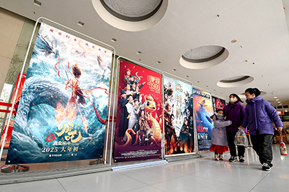 2025年2月3日,河北省邯郸市一家影院,观众从电影海报前走过。(郝群英摄/光明图片)