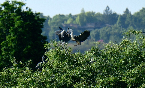 2025年5月8日,云南省红河哈尼族彝族自治州弥勒市弥阳街道,天蓝树绿夏意浓浓,吸引苍鹭站在绿树枝头跳起“芭蕾舞”。(普佳勇摄/光明图片)