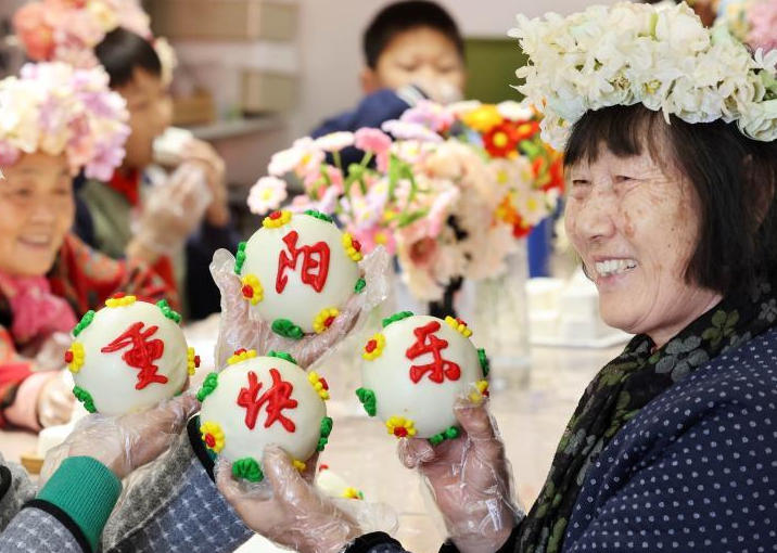 江苏省连云港市连云区,社区工作人员制作的"重阳快乐"花馍受到老年人青睐。(朱华南摄/光明图片)