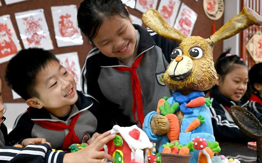 2025年10月30日,河北省邯郸市复兴区铁路小学的学生在参观用硬纸板、彩泥等制作的"萌兔乐园"。(郝群英摄/光明图片)
