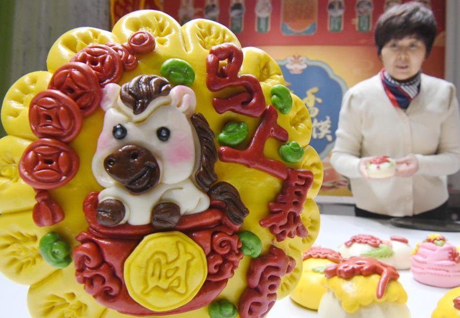 2026年1月19日,河北省邯郸市广平县花馍非遗传承人孙菊慧展示含有马年春节元素的花馍。(程学虎摄/光明图片)