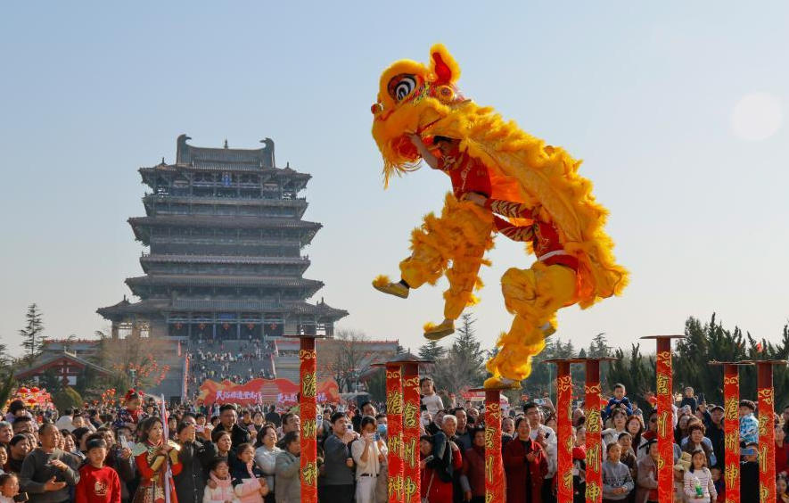 2026年2月18日,游客在山西省运城市永济市鹳雀楼景区观看舞狮表演。(闫鑫摄/光明图片)