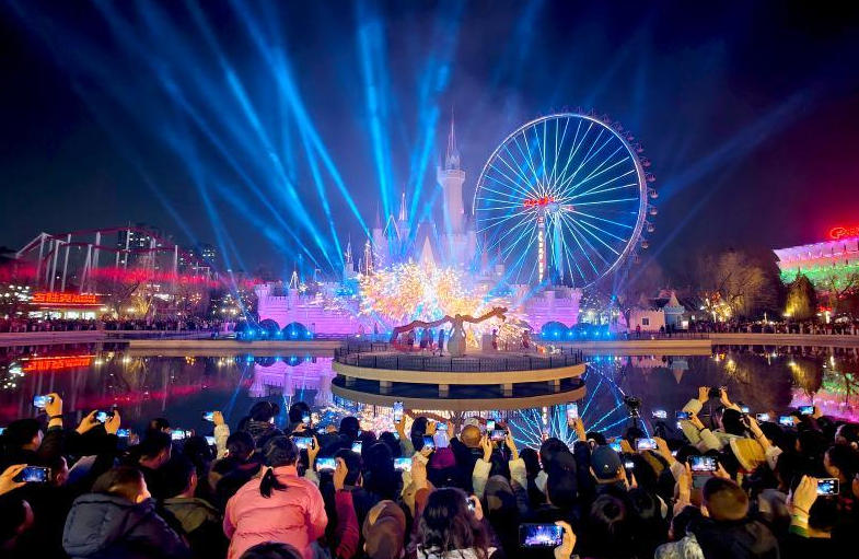 2026年2月20日,游人在北京石景山游乐园观赏非遗奇观"火龙钢花"表演。(李文明摄/光明图片)