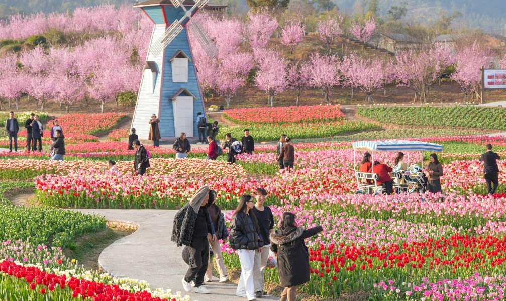 2026年2月24日,重庆市垫江县牡丹樱花世界景区,游客在观赏郁金香。(龚长浩摄/光明图片)