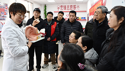 2026年3月3日,在河北省石家庄市栾城区向阳社区,医务人员给居民进行讲解耳朵的结构及护耳知识。(李明发摄/光明图片)