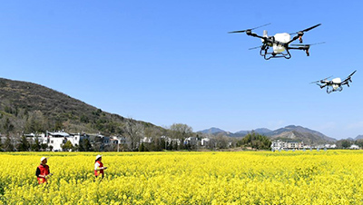 湖北省咸宁市通城县塘湖镇龙印村千亩高产油菜示范基地,农技人员操控植保无人机开展飞防作业,以科技助力春耕。