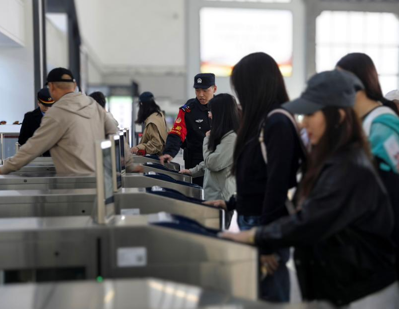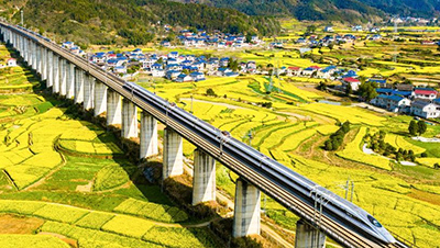 湖南省怀化市中方县境内,沪昆高铁穿行于开满油菜花的田园间。高铁、金浪花海与蓝天、青山、村庄交相辉映,构成一幅生机盎然的新时代乡村画卷。