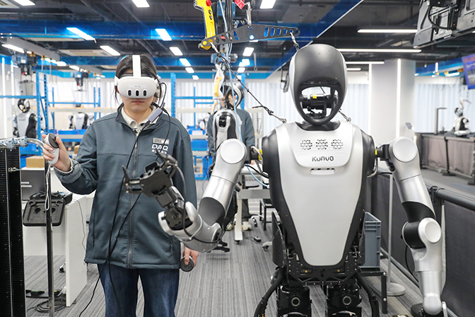 青岛市人形机器人数据采集训练场内,00后数据采集师通过VR设备与感应手柄,指导机器人完成抓取、分拣、整理等操作。