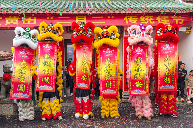 2026年3月20日,在广西壮族自治区贺州市平桂区黄田镇,舞狮人表演醒狮送祝福,欢庆“二月二”龙抬头。(廖祖平摄/光明图片)