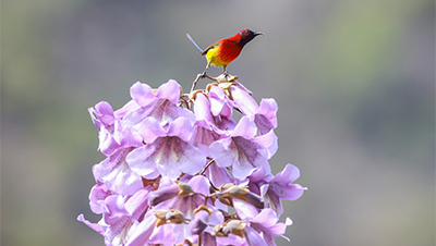 2026年3月28日,重庆市巫山县两坪乡同心村泡桐花盛开,蓝喉太阳鸟在花间嬉戏、觅食。(冯光伦摄/光明图片)