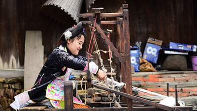 2026年4月12日,绣娘在贵州省黔东南苗族侗族自治州从江县丙妹镇岜沙苗寨进行苗布、苗绣非遗制作。近年来,贵州省从江县依托本地民族文化特色,充分发挥乡土人才资源优势,积极开展苗绣、侗绣技艺培训,将传承手工技艺与促进就业相结合,让“指尖技能”转变为“指尖经济”,助力当地妇女添技增收。(石宏辉摄/
