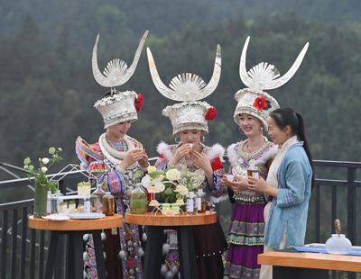 2026年4月12日,绣娘在贵州省黔东南苗族侗族自治州从江县丙妹镇岜沙苗寨开展苗布苗绣非遗制作。(石宏辉摄/
