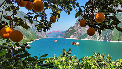 2026年4月18日,船舶行驶在长江西陵峡的湖北省宜昌市秭归县屈原镇境内的江面上。阳春三月,长江西陵峡湖北省宜昌市秭归县境内,春橙挂满枝头。青山碧水,花果同枝,交织成一幅壮丽的画卷。(魏启扬摄/光明图片)
