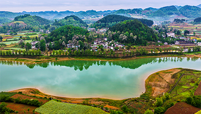 贵州省黔西市绿化白族彝族乡大海村的大海子湖泊,碧水蓝天、翠柳成荫,与山村农家房舍交相辉映,春意盎然、美如画卷。