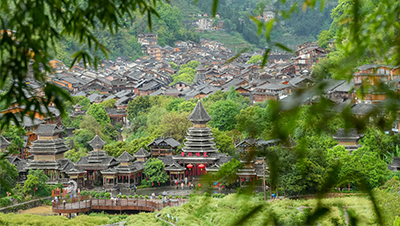 暮春时节,贵州省黎平县肇兴侗寨层楼叠榭与吐翠林木相映成趣,宛如一幅美丽乡村生态画卷。